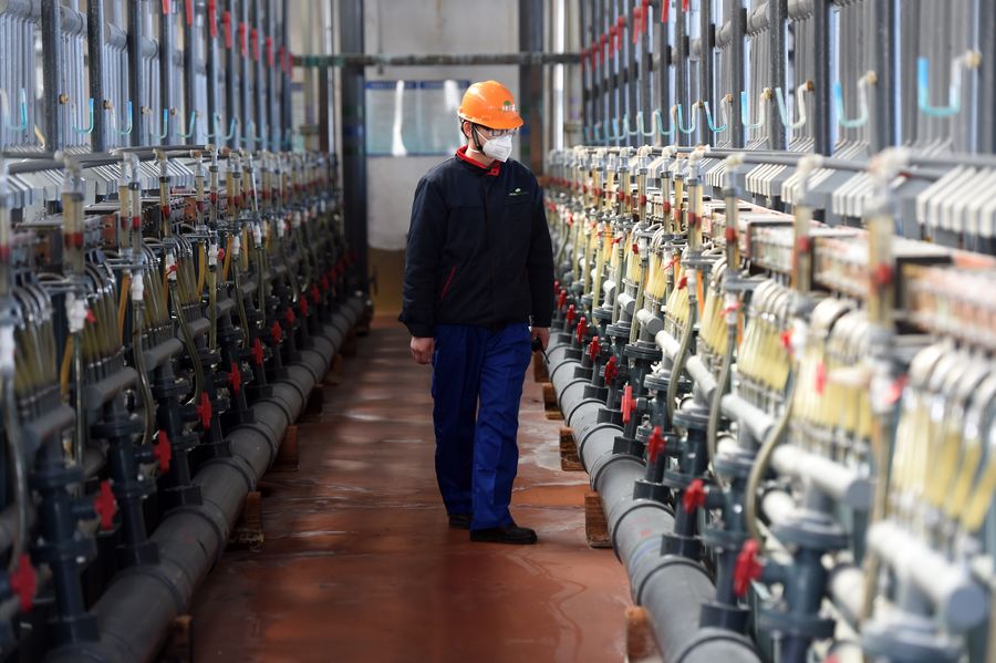 An employee inspects the electrolytic cells at the United Initiators Hefei Co., Ltd. at a circular economy demonstration park in Hefei, east China's Anhui Province, Feb. 18, 2020. (Photo by Zhou Mu/Xinhua)