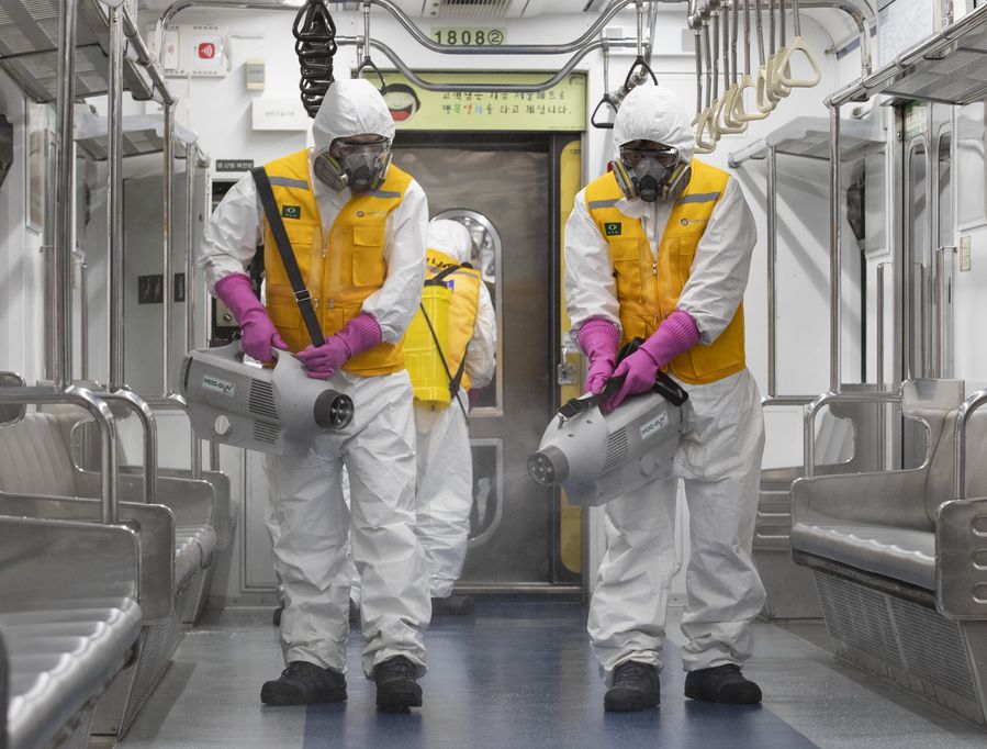 Staff members sterilize a metro train in Seoul, South Korea, March 11, 2020.(Xinhua/Lee Sang-ho)