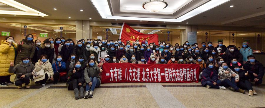 Members of a medical team from Peking University First Hospital pose for group photos before setting out to Hubei Province in Beijing, capital of China, Feb. 7, 2020. (Photo by Fu Jingbo/Xinhua)
