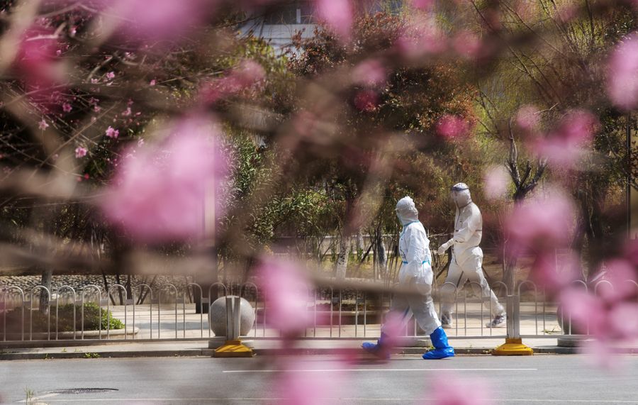 Medical workers walk past cherry trees at a hospital in Wuhan, central China's Hubei Province, March, 14, 2020. (Xinhua/Fei Maohua)