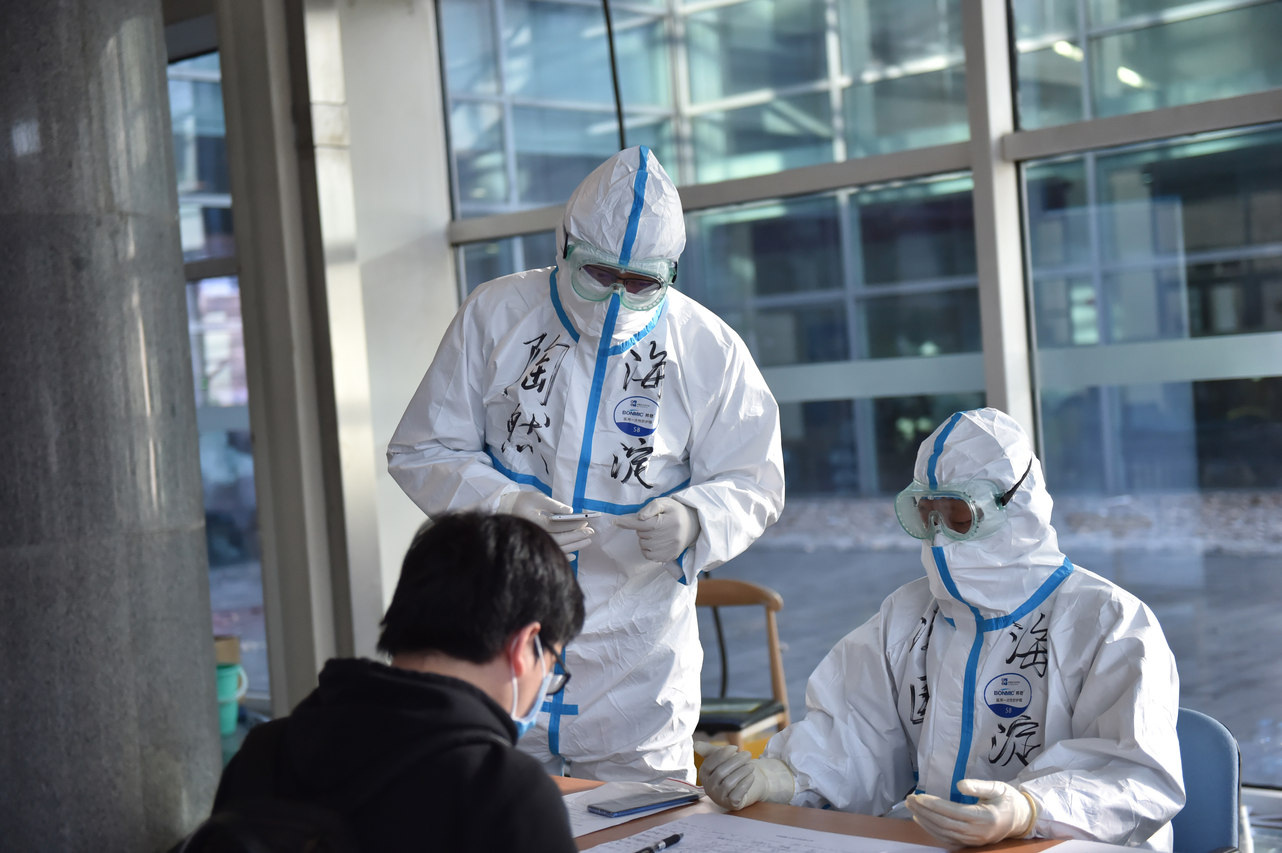 Staff members inquire information of a passenger at the New China International Exhibition Center in Beijing, March 14, 2020. (Xinhua/Chen Zhonghao)