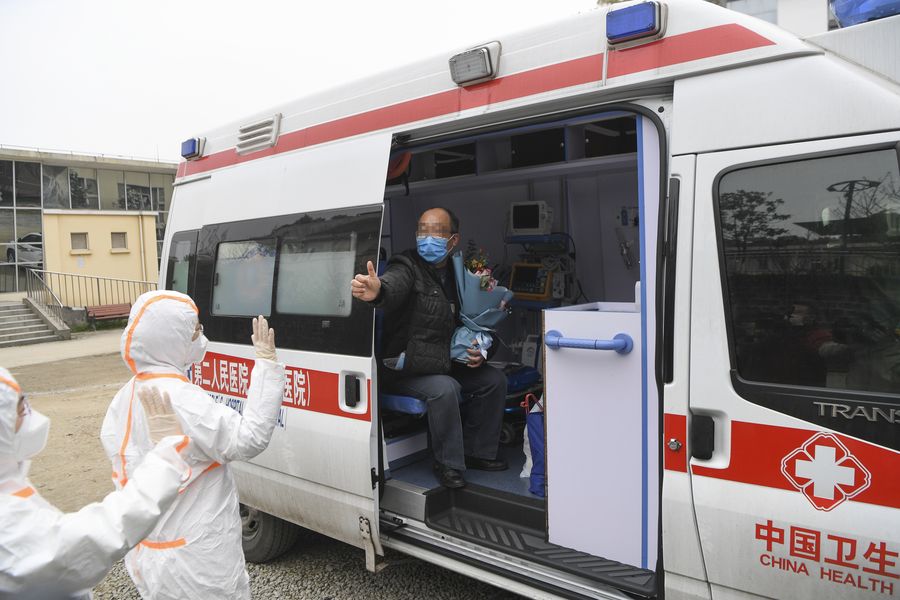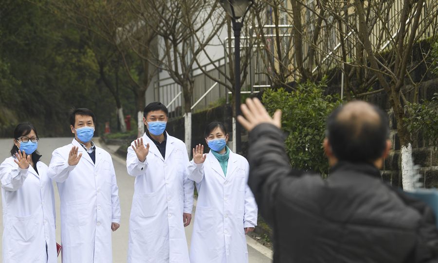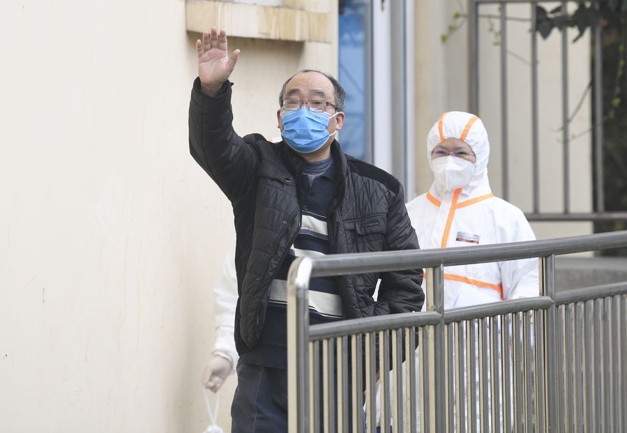 A recovered patient waves to bid farewell to the medical staff at the Chongqing Public Health Center in southwest China's Chongqing, March 15, 2020. (Xinhua/Wang Quanchao)