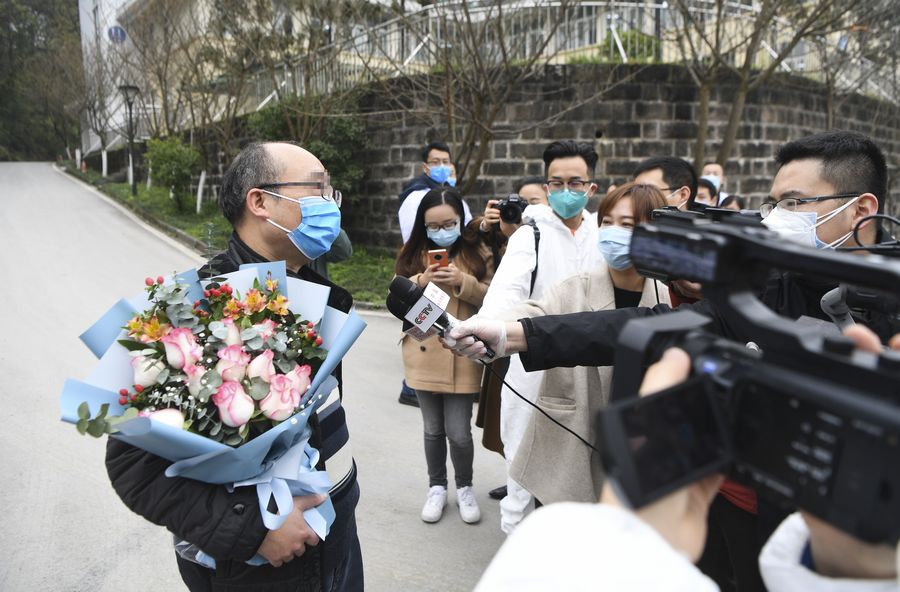 A recovered patient takes interviews as he leaves the Chongqing Public Health Center in southwest China's Chongqing, March 15, 2020. (Xinhua/Wang Quanchao)■