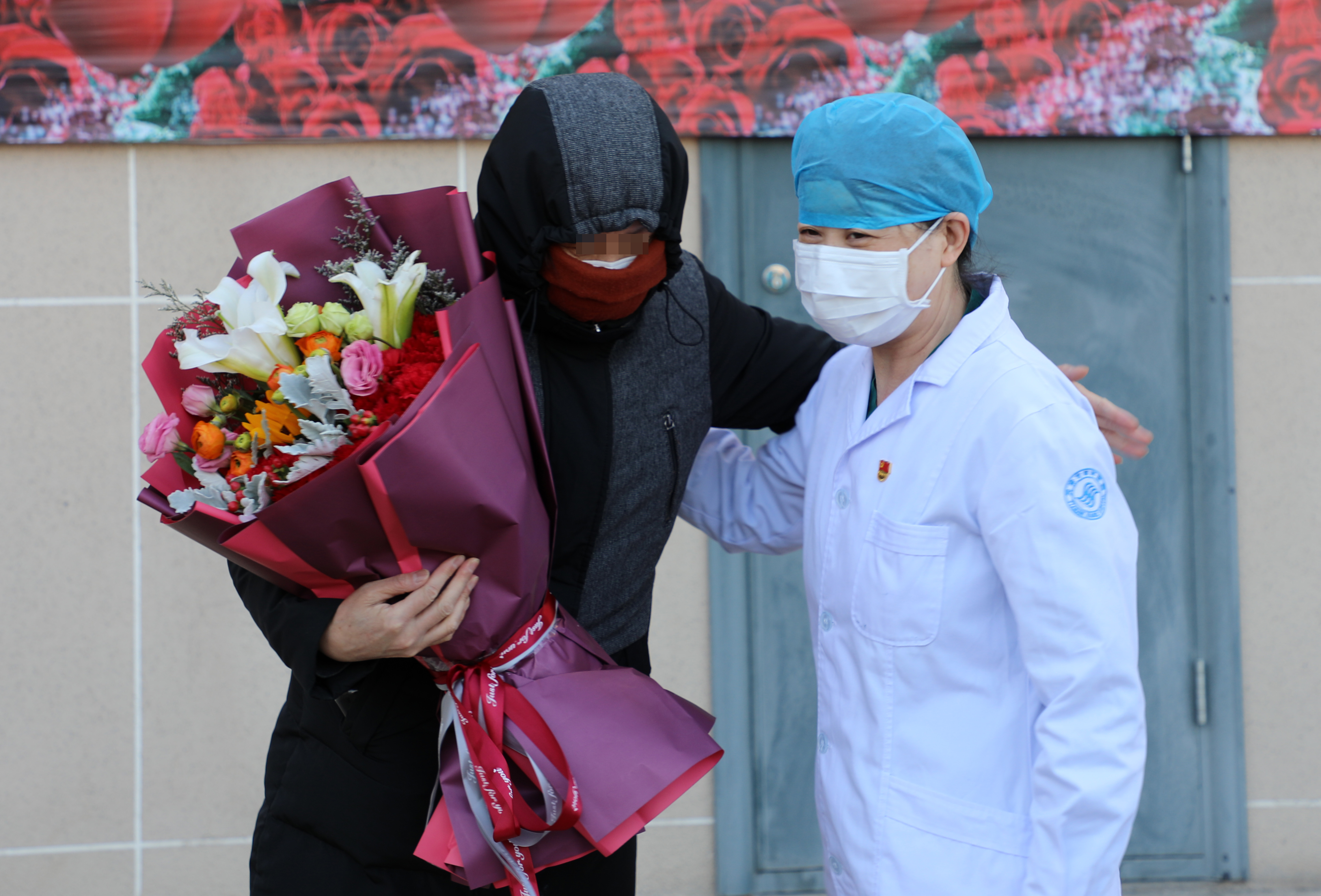 A medical worker presents a bouquet to a recovered patient at the Chongqing Public Health Center in southwest China's Chongqing, March 15, 2020. (Xinhua/Wang Quanchao)