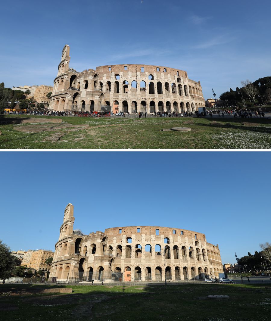 Combo photo shows the Colosseum on March 6, 2019 (top) and March 16, 2020 in Rome, Italy.(Xinhua/Cheng Tingting)