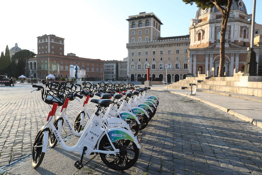 Sharing bikes sit idle on Piazza Venezia in Rome, Italy, March 16, 2020.(Xinhua/Cheng Tingting)