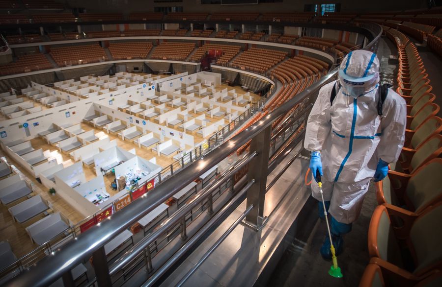 A volunteer disinfects a makeshift hospital in Wuhan, central China's Hubei Province, March 8, 2020. The makeshift hospital converted from a sports venue was closed after its last batch of cured COVID-19 patients were discharged. (Xinhua/Xiao Yijiu)