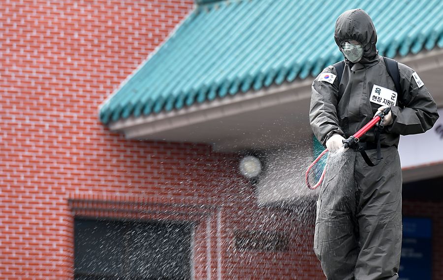 A soldier disinfects an apartment building where mass coronavirus infections occurred in Daegu, South Korea, March 9, 2020. (NEWSIS/Handout via Xinhua)
