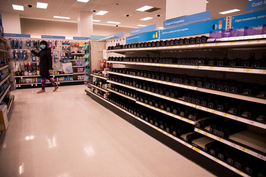 A shopper wearing a face mask passes by empty shelves in a pharmacy in New York, the United States, March 17, 2020. (Photo by Michael Nagle/Xinhua)