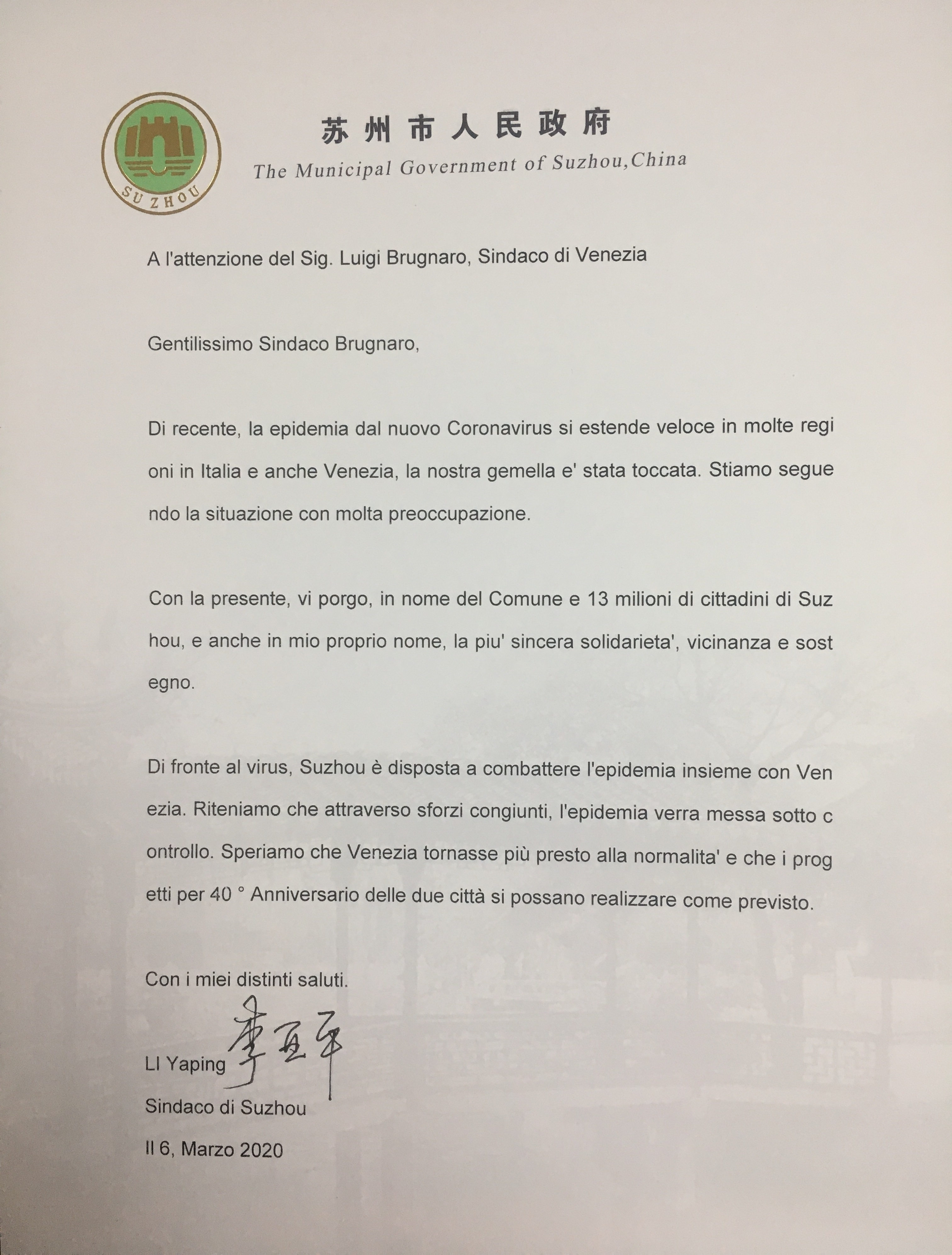 Photo taken on March 6 shows a letter of sympathy by the city mayor of Suzhou to the mayor of Italy's Venice. (Photo provided to Xinhua)
