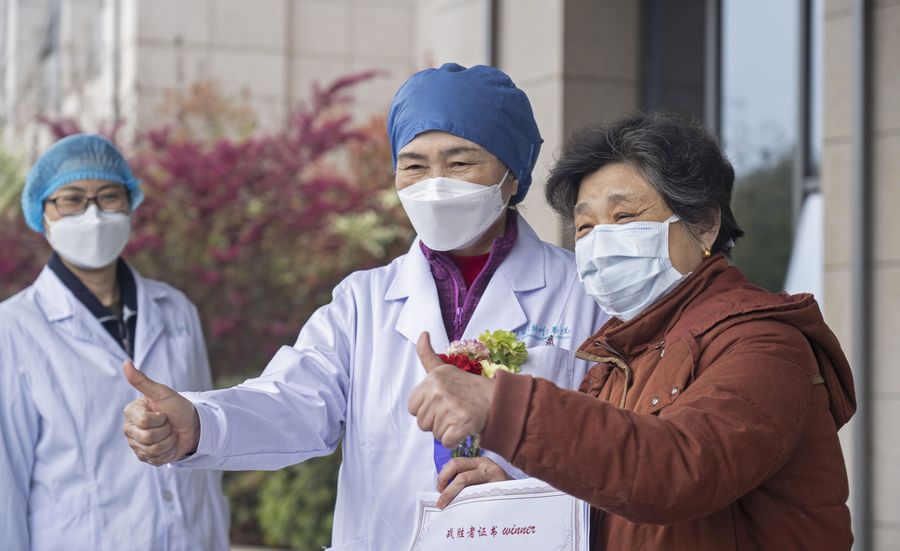 Li Lanjuan (C), a renowned Chinese epidemiologist, poses for a photo with the 600th cured patient of COVID-19 at the east branch of Renmin Hospital of Wuhan University in Wuhan, central China's Hubei Province, March 16, 2020. (Xinhua/Cai Yang)