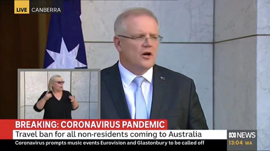 Australian Prime Minister Scott Morrison announced travel ban to all non-residents at a press conference on March 19, 2020 in Canberra, Australia in response to the outbreak of COVID-19. (Photo credit: Australian Broadcasting Corporation)