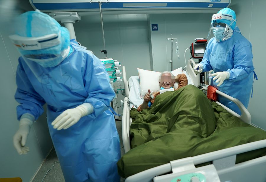A COVID-19 patient gives a thumb-up to medical workers of the ICU (intensive care unit) at the Huoshenshan (Fire God Mountain) Hospital in Wuhan, central China's Hubei Province, March 17, 2020. (Xinhua/Wang Yuguo)