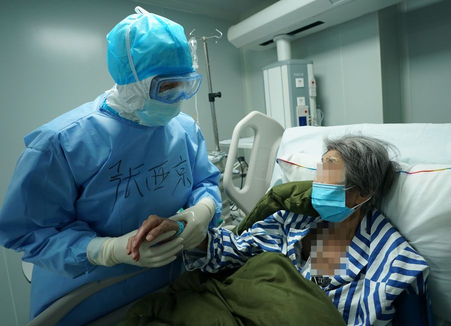 Zhang Xijing, director of the ICU (intensive care unit), inquires the condition of a COVID-19 patient at the Huoshenshan (Fire God Mountain) Hospital in Wuhan, central China's Hubei Province, March 17, 2020.(Xinhua/Wang Yuguo)