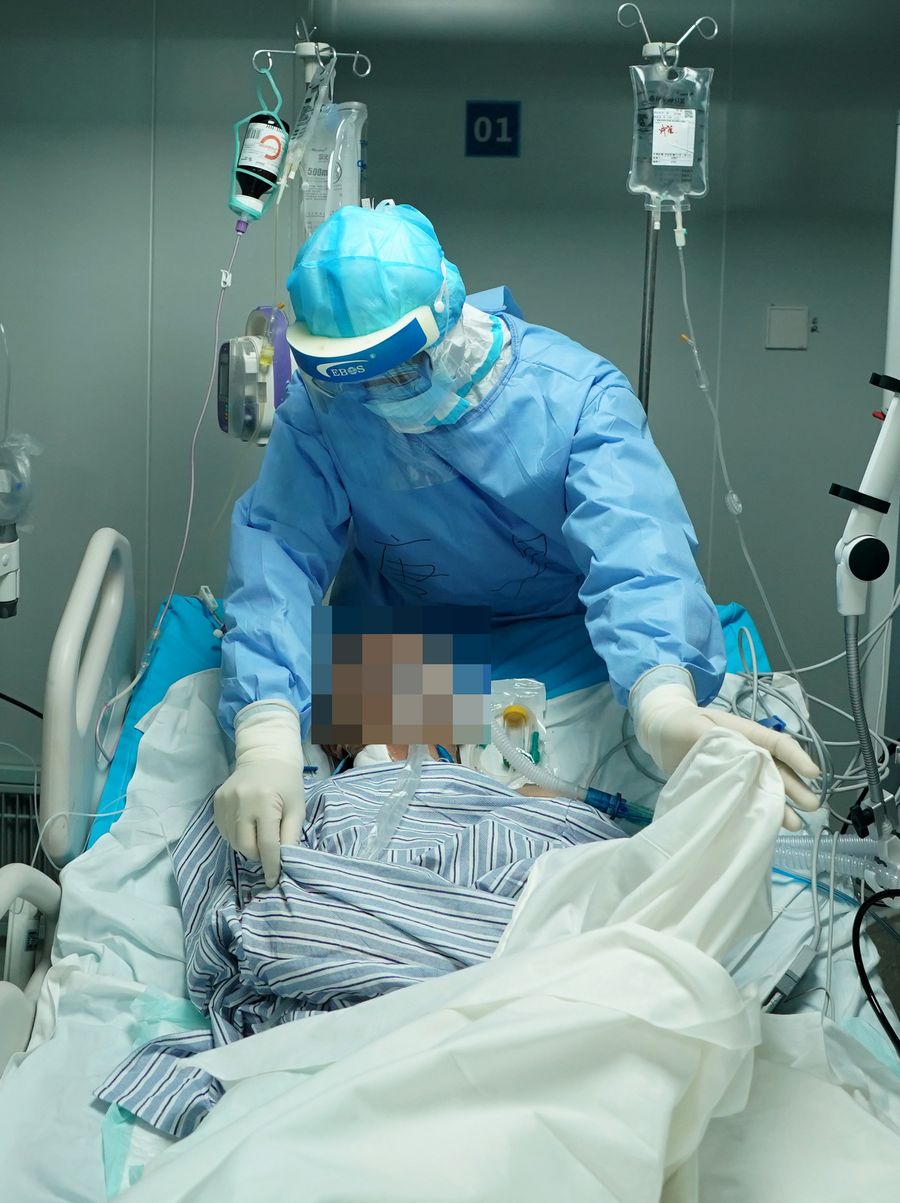 Fu Yujia, a post-90s nurse of the ICU (intensive care unit), takes care of a COVID-19 patient at the Huoshenshan (Fire God Mountain) Hospital in Wuhan, central China's Hubei Province, March 17, 2020.(Xinhua/Wang Yuguo)