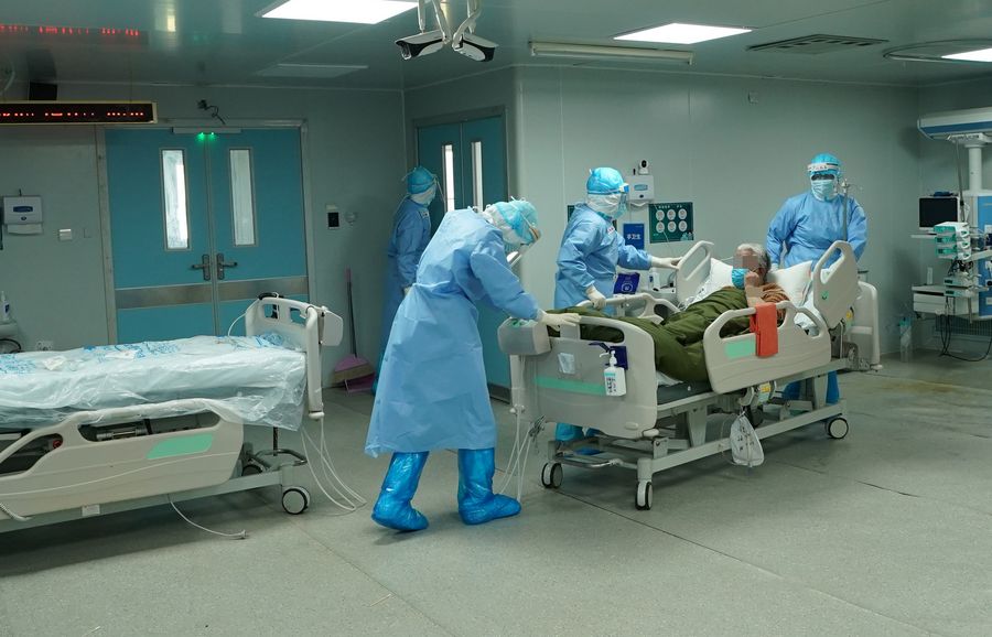 Medical workers transfer a COVID-19 patient whose condition have improved from the ICU (intensive care unit) at the Huoshenshan (Fire God Mountain) Hospital in Wuhan, central China's Hubei Province, March 17, 2020.(Xinhua/Wang Yuguo)