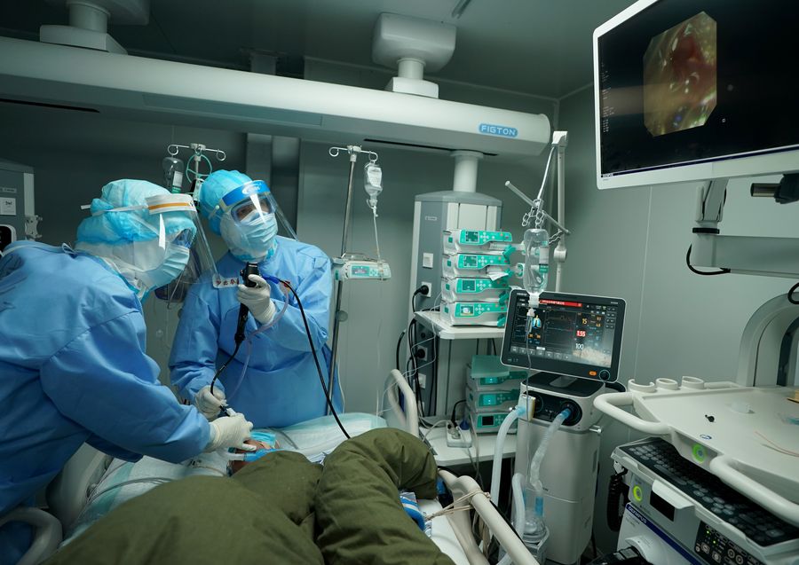 Medical workers conduct sputum cleaning via bronchoscope for a COVID-19 patient at the Huoshenshan (Fire God Mountain) Hospital in Wuhan, central China's Hubei Province, March 17, 2020.(Xinhua/Wang Yuguo)■