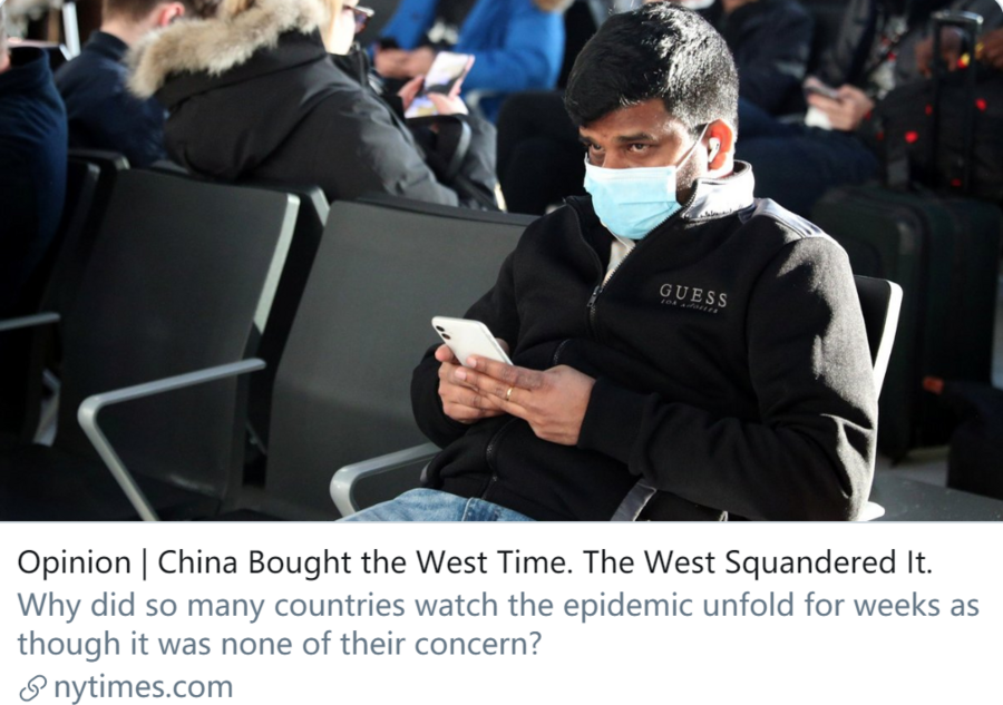 For example, The New York Times, which has since the outbreak run numerous coronavirus stories criticizing China's epidemic containment efforts along with its overall political system, published recently an opinion piece titled "China Bought the West Time. The West Squandered It."