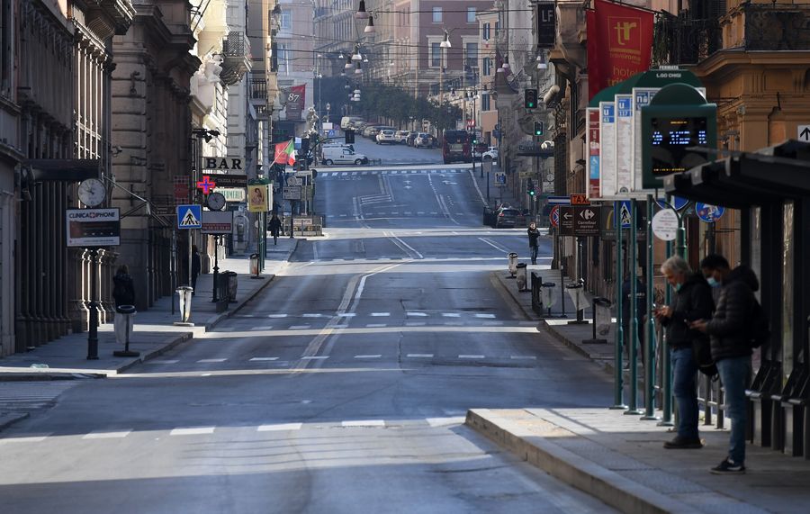 People wearing face masks are seen in Rome, Italy, on March 18, 2020. (Photo by Alberto Lingria/Xinhua)