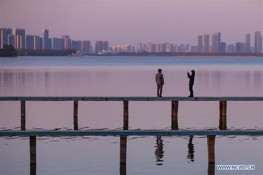 People enjoy sunset on a plank road at the Donghu Lake in Wuhan, capital of central China's Hubei Province, March 18, 2020. No new infections of the novel coronavirus were reported on Wednesday in Wuhan, the epicenter of the epidemic, marking a notable first in the city's months-long battle with the microscopic foe. (Xinhua/Shen Bohan)