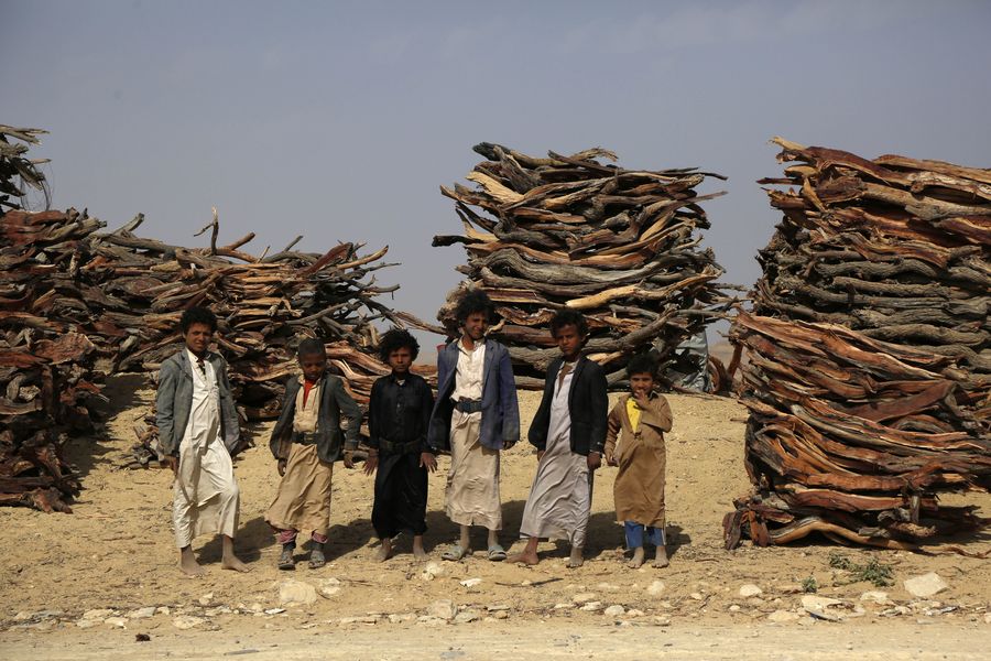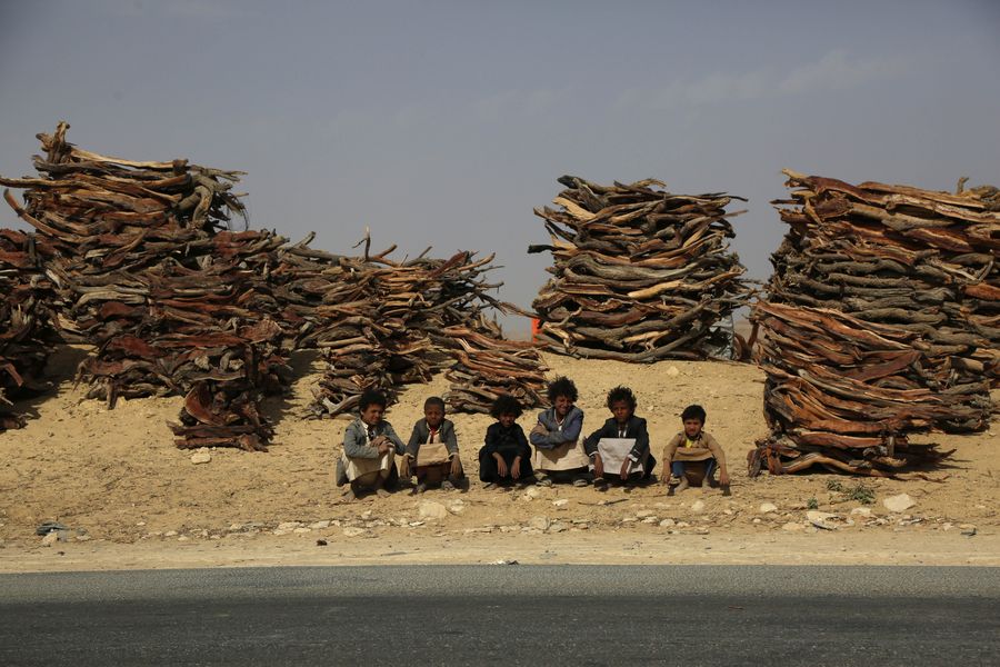 Children are seen near woods displayed for sale at a street in Saada province, Yemen, March 18, 2020. (Xinhua/Mohammed Mohammed)