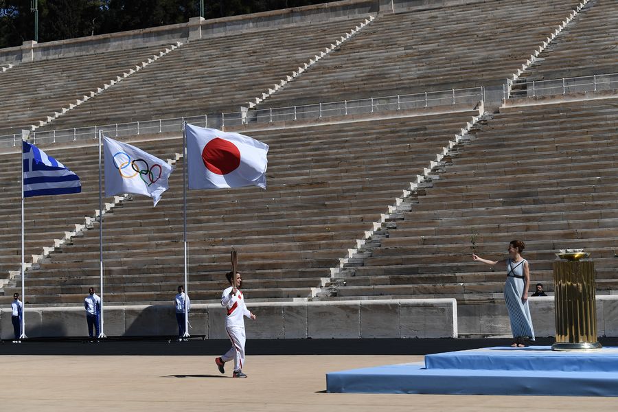 Naoko Imoto, an Olympian in swimming at the Olympic Games of Atlanta 1996, holds a torch with the Tokyo Olympic Flame at the Panathenaic stadium, in Athens, Greece, on March 19, 2020. (Photo by Aris Messinis-pool photo/Xinhua)