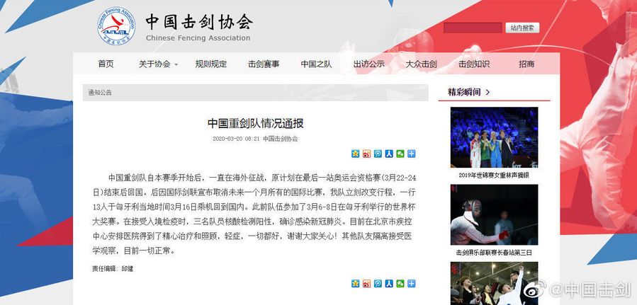 Chinese Fencing Association announced that three Chinese fencers had tested positive for COVID-19 in a statement posted on its offical website
