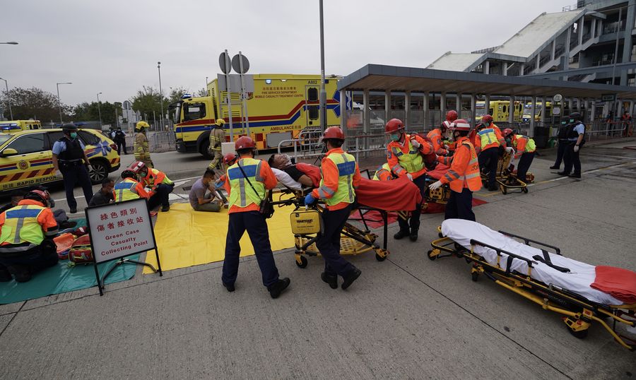 The exercise comprised two sessions. The first session was staged at the public transport interchange at the Lok Ma Chau Spur Line Control Point. A man detonated a radio-controlled bomb in a rubbish bin, resulting in multiple casualties. The area was then cordoned off for rescue and investigation by officers from the Hong Kong Police Force (HKPF) and Fire Services Department (FSD) who sped to the scene.