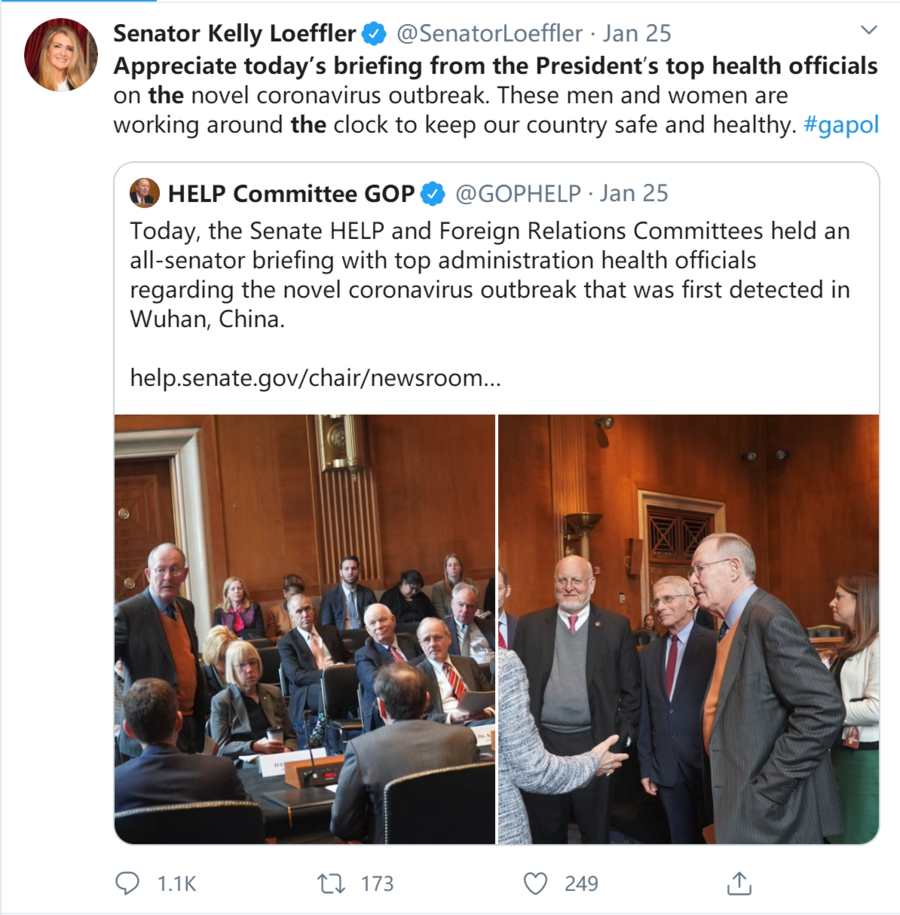 Sen. Kelly Loeffler (R-GA) reported the first sale of stock jointly owned by her and her husband on Jan. 24, the very day that her committee, the Senate Health Committee, hosted a private, all-senators briefing from administration officials, including the CDC director and Anthony Fauci, the head of the National Institute of Allergy and Infectious Diseases, on the coronavirus.