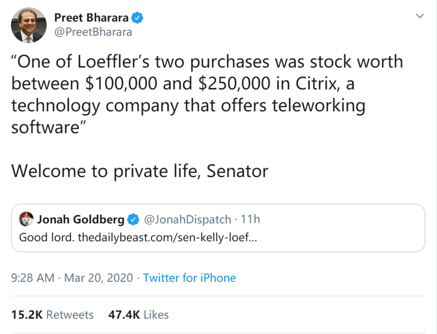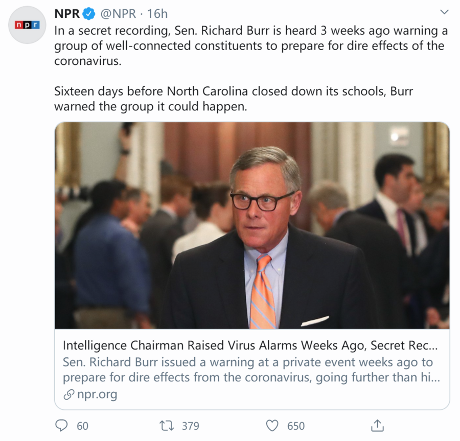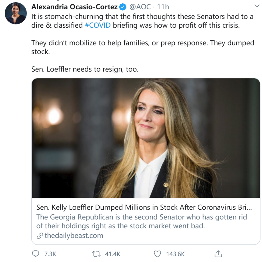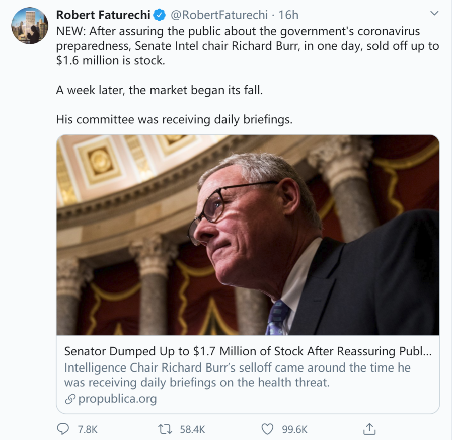 It is stomach-churning that the first thoughts these Senators had to a dire & classified #COVID briefing was how to profit off this crisis.