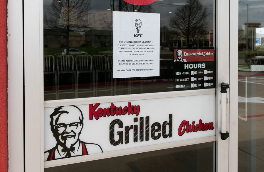 A Kentucky Fried Chicken fast food restaurant closes its dine-in room due to the spread of COVID-19 in Plano, Texas, the United States on March 19, 2020. (Photo by Dan Tian/Xinhua)