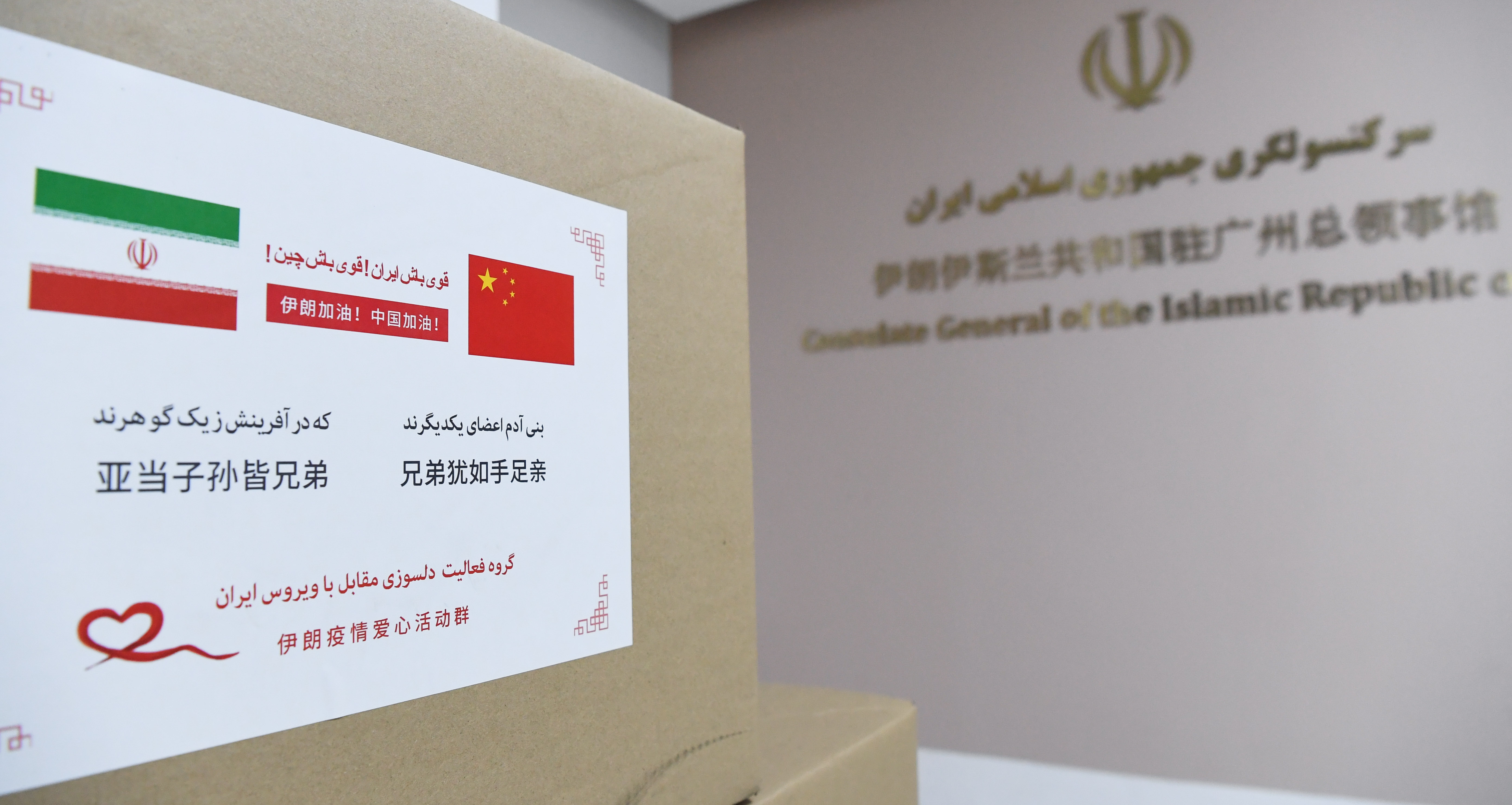 Photo taken on March 18, 2020 shows a box of donations received by the Iranian Consulate General in Guangzhou, south China's Guangdong Province. (Xinhua/Deng Hua)