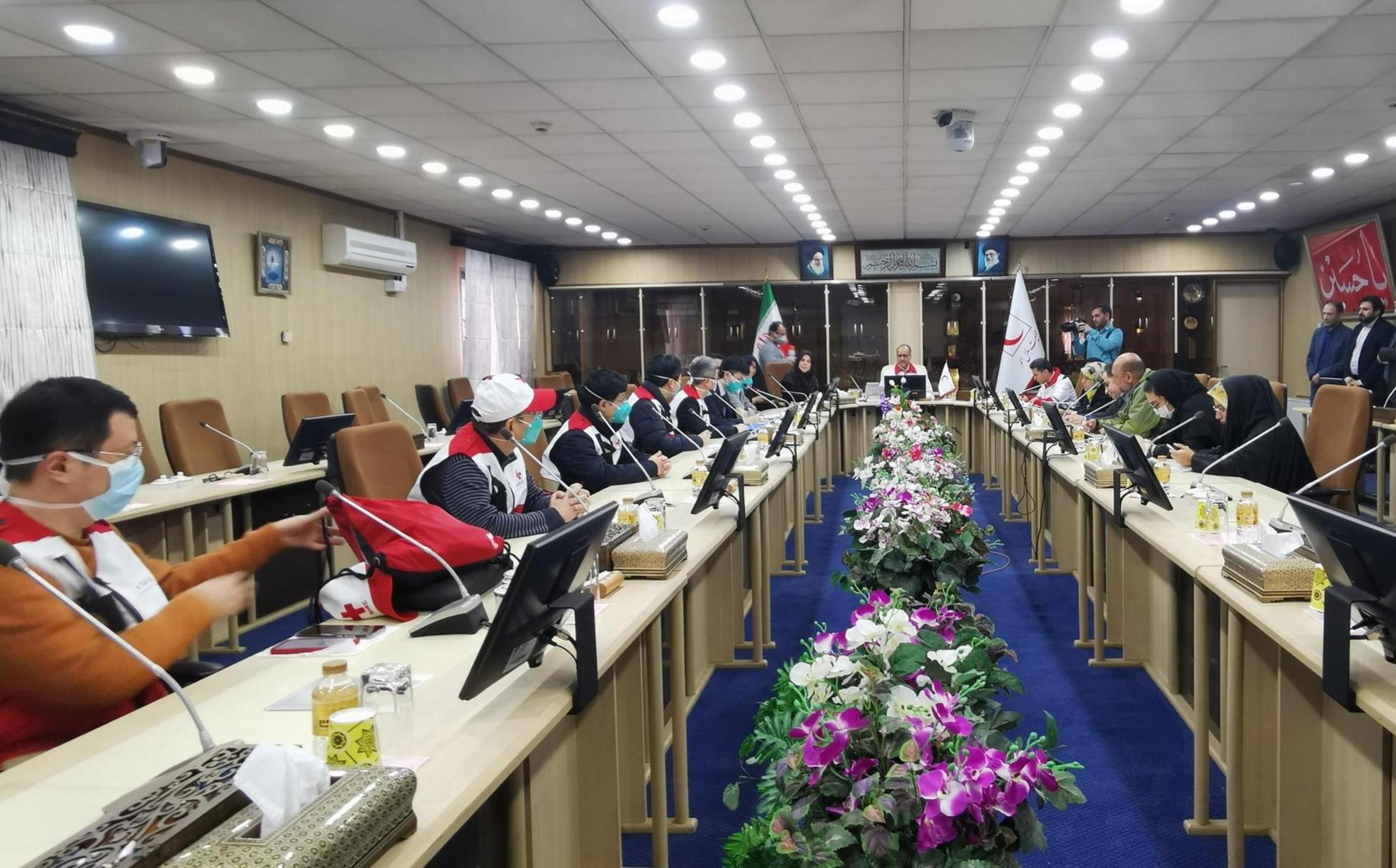 Chinese medical team members meet with Iranian Red Crescent Society officials in Tehran, Iran, March 2, 2020. (Chinese Embassy in Iran/Handout via Xinhua)
