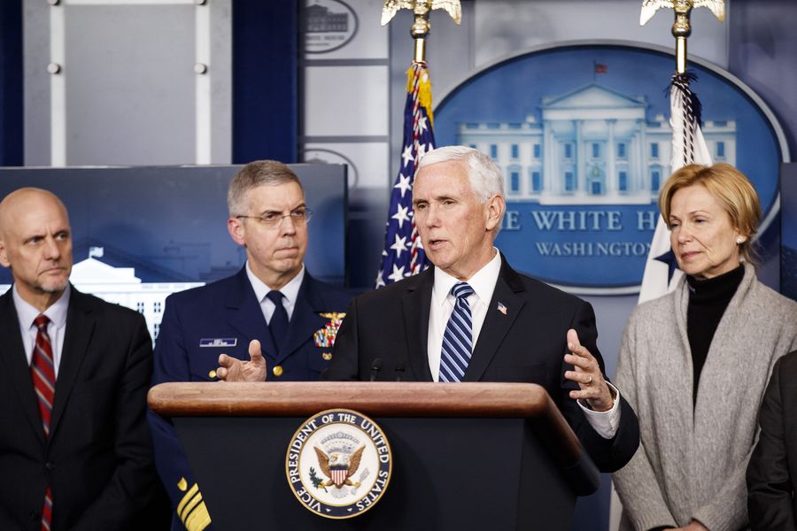 U.S. Vice President Mike Pence (front) along with members of the Coronavirus Task Force attend a press conference at the White House in Washington D.C., the United States, March 6, 2020. (Photo by Ting Shen/Xinhua)