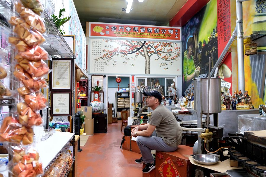 The store owner Kevin Chan sits at his Golden Gate Fortune Cookie Factory in San Francisco's Chinatown, California, the United States, March 20, 2020. (Xinhua/Wu Xiaoling)