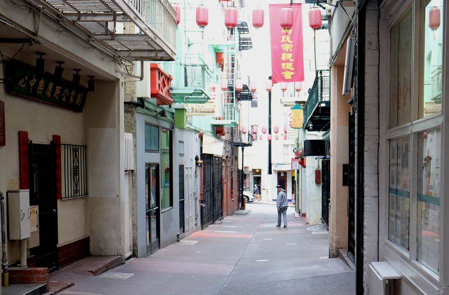 The store owner Kevin Chan walks in the alley where his Golden Gate Fortune Cookie Factory is located in San Francisco's Chinatown, California, the United States, March 20, 2020. (Xinhua/Wu Xiaoling)
