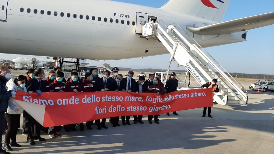 Members of the second batch of the Chinese medical team along with local people hold a banner reading "We are waves of the same sea, leaves of the same tree, flowers of the same garden" and pose for a group photo after they arrived at Milan Malpensa Airport in Milan, Italy, March 18, 2020. (Xinhua)