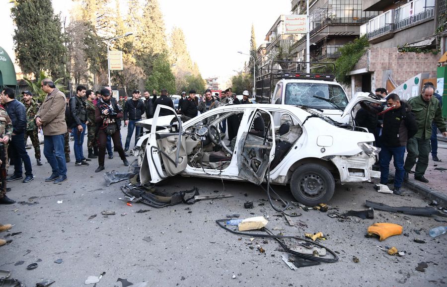A bombed-out car is seen in Damascus, Syria on Feb. 25, 2020. An explosive device ripped through a car in Damascus on Tuesday. (Photo by Ammar Safarjalani/Xinhua)