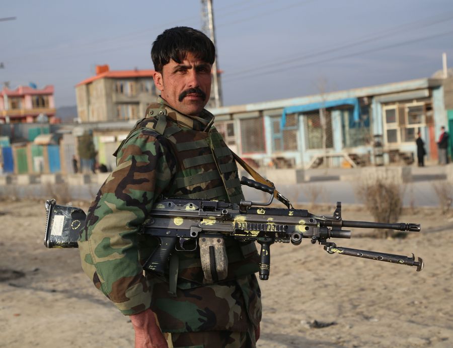 An Afghan security force member stands at the site of a blast in Kabul, capital of Afghanistan, Feb. 26, 2020. At least 10 people were injured as an explosive-borne motorbike exploded in the Police District 6 on Wednesday afternoon in the Afghan capital, police said. (Photo by Rahmatullah Alizadah/Xinhua)