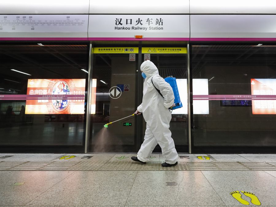 A staff conducts disinfection on the platform of the subway station of Hankou Railway Station in Wuhan, central China's Hubei Province, March 23, 2020. (Xinhua/Shen Bohan)