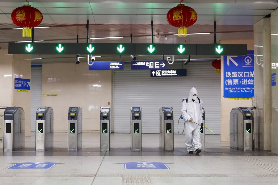 A staff member conducts disinfection at a subway station in Wuhan, central China's Hubei Province, March 23, 2020. (Xinhua/Shen Bohan)