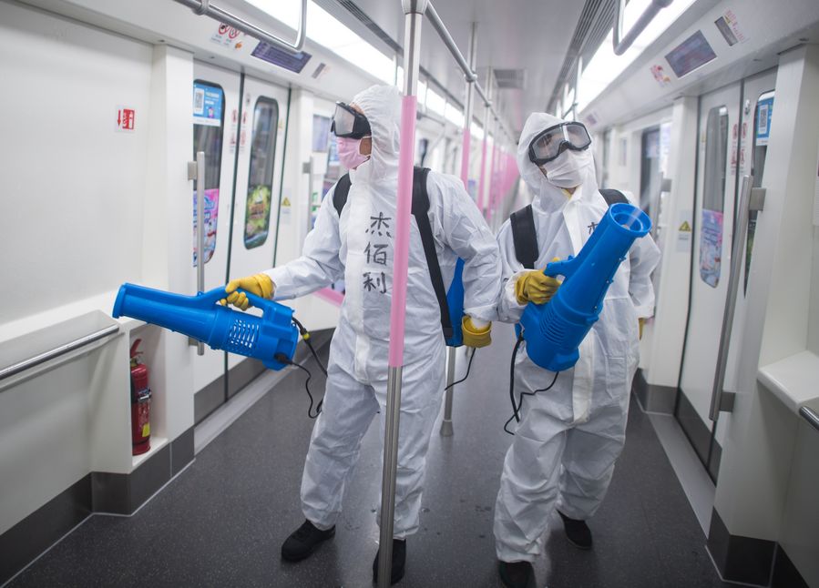 Staff members conduct disinfection on a subway train in Wuhan, central China's Hubei Province, March 23, 2020. (Xinhua/Xiao Yijiu)