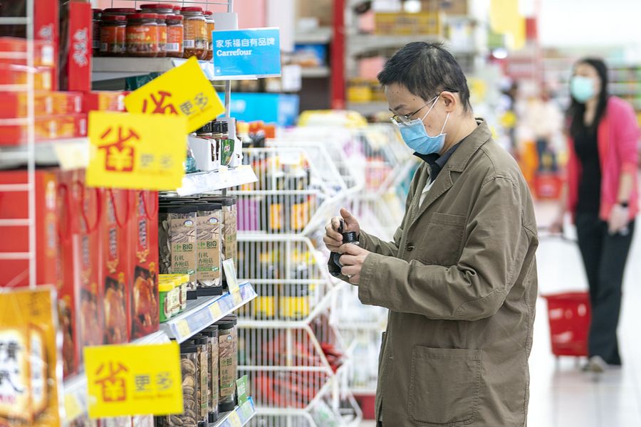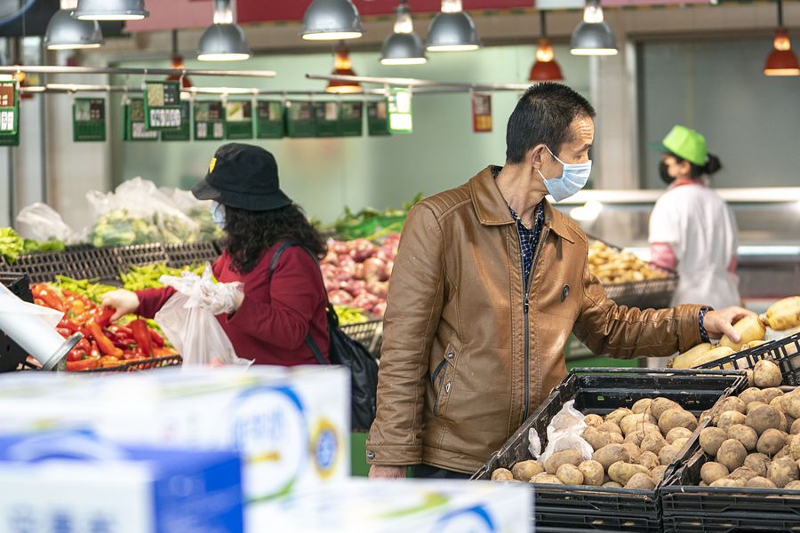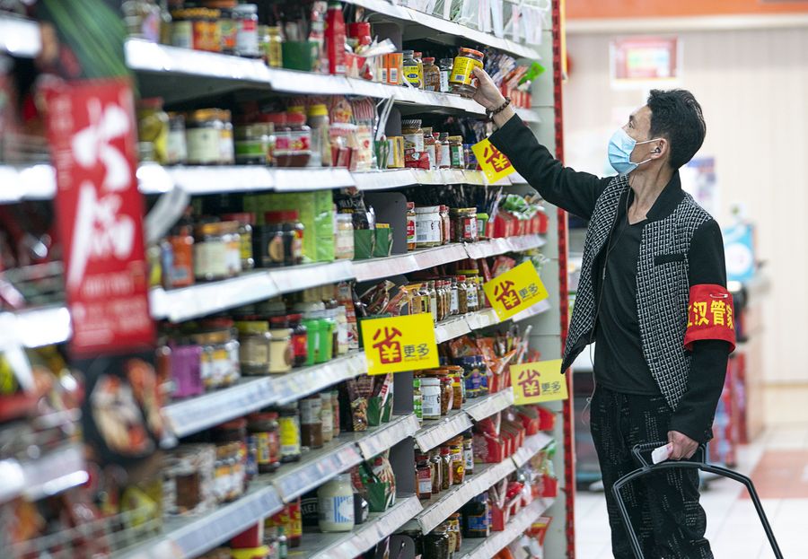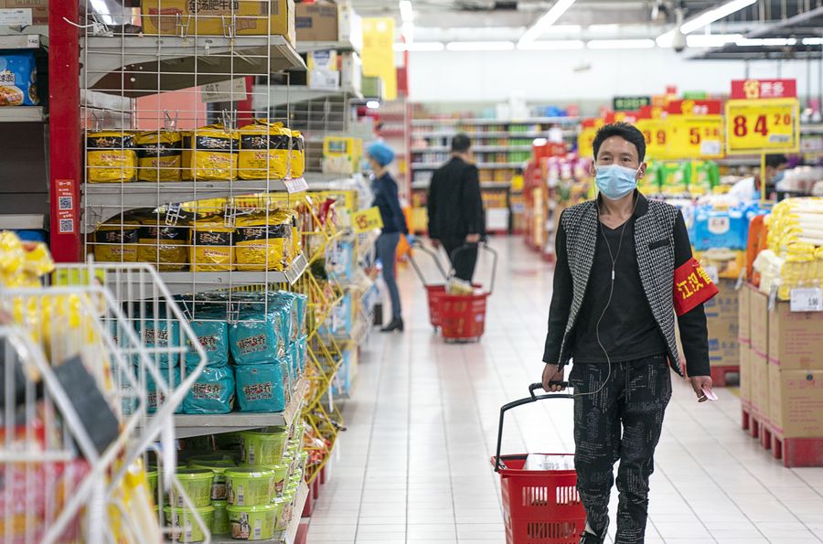 A man shops at a supermarket in Wuhan, central China's Hubei Province, March 24, 2020. (Xinhua/Xiong Qi)■