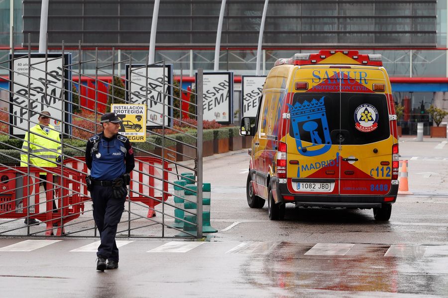 An ambulance arrives at the IFEMA Exhibition center in Madrid, Spain, March 23, 2020. SPAIN OUT. LATIN AMERICA OUT. (EFE/Handout via Xinhua)■