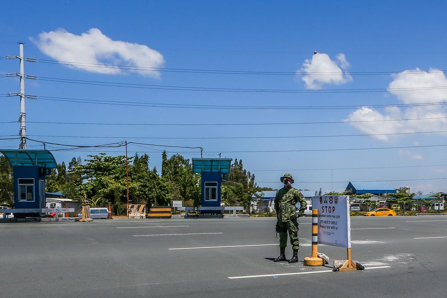 A policeman from the Philippine National Police (PNP) mans a checkpoint in Bacoor City, the Philippines on March 23, 2020.(Xinhua/Rouelle Umali)