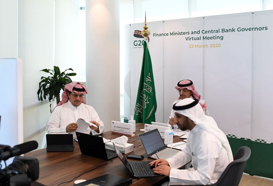 Governor of Saudi Arabian Monetary Authority Ahmed al-Kholifey (L) and Saudi Finance Minister Mohammed al-Jadaan (Rear) attend the G20 Finance Ministers and Central Bank Governors Virtual Meeting in Riyadh, Saudi Arabia, on March 23, 2020. (G20 Saudi Arabia/Handout via Xinhua)