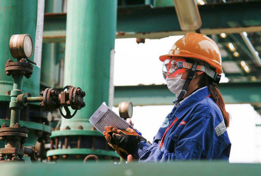 An employee works at a base of Dow Chemical Company in Zhangjiagang, east China's Jiangsu Province, March 8, 2020. (Xinhua)