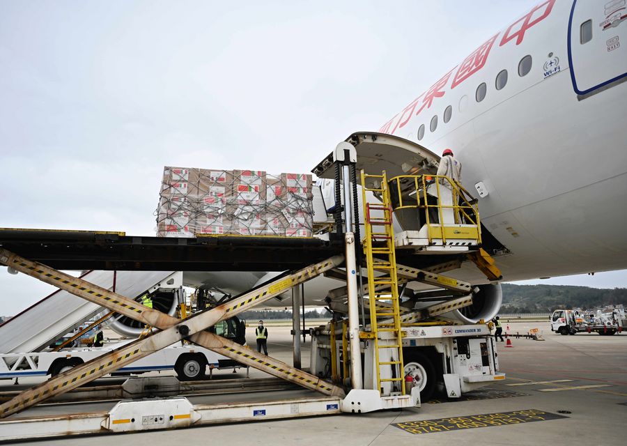 Staff load donated medical materials onto a chartered plane in Fuzhou, southeast China's Fujian Province, March 25, 2020. (Xinhua/Wei Peiquan)