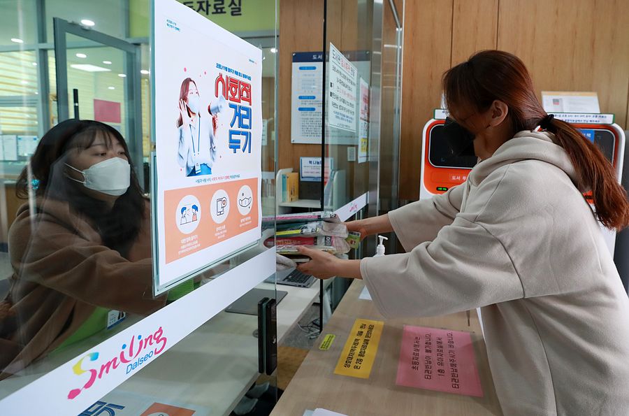 People borrow books in a library in Daegu, South Korea, March 24, 2020. (Newsis/Handout via Xinhua)