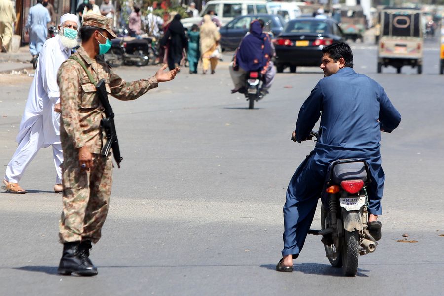 A security personnel talks with a resident on a road during lockdown as a preventive measure against COVID-19 in southern Pakistani port city of Karachi on March 24, 2020. (Stringer/Xinhua)
